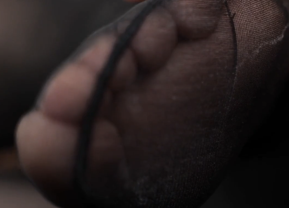 Wir sehen eine Nahaufnahme von Aiba Yōkis mit Strumpfhosen bekleideten Fußsohlen. In der Nähe ihres großen Zehs ist ein weißer Schmutzstreifen zu erkennen.