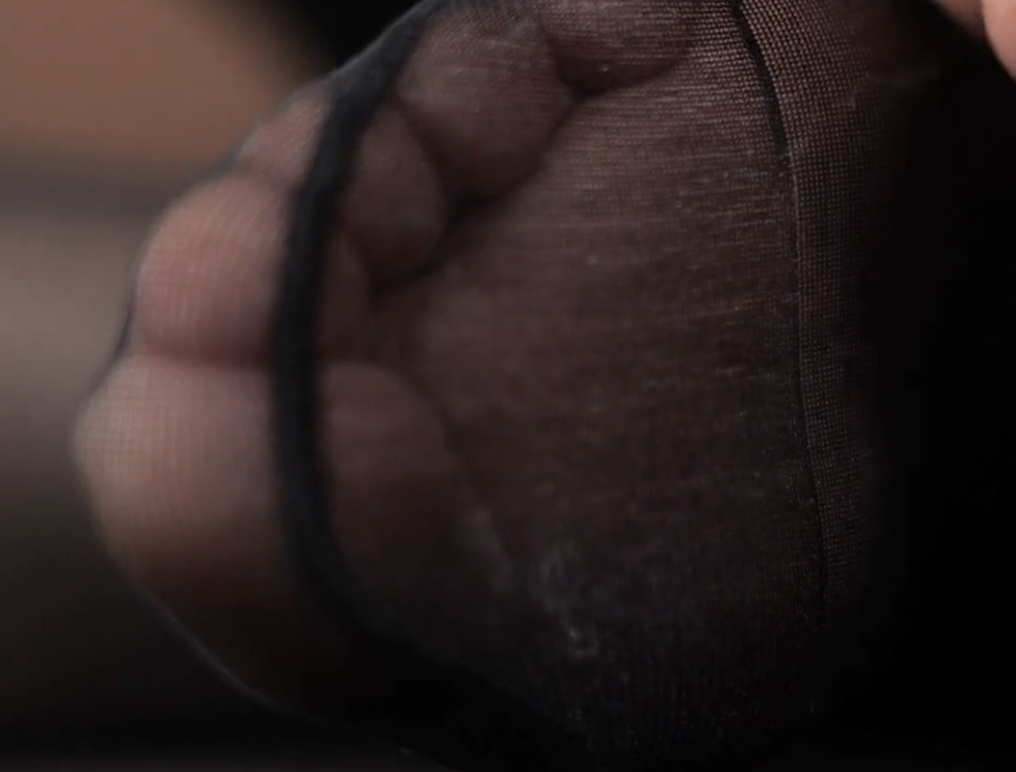 We see a close-up of Aiba Yuki's black pantyhose-clad soles and notice a white streak of grime near her big toe.