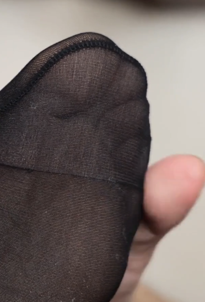 愛葉陽葵さんの黒パンストの足裏がアップになりますが、親指付近に白い汚れの線があります。